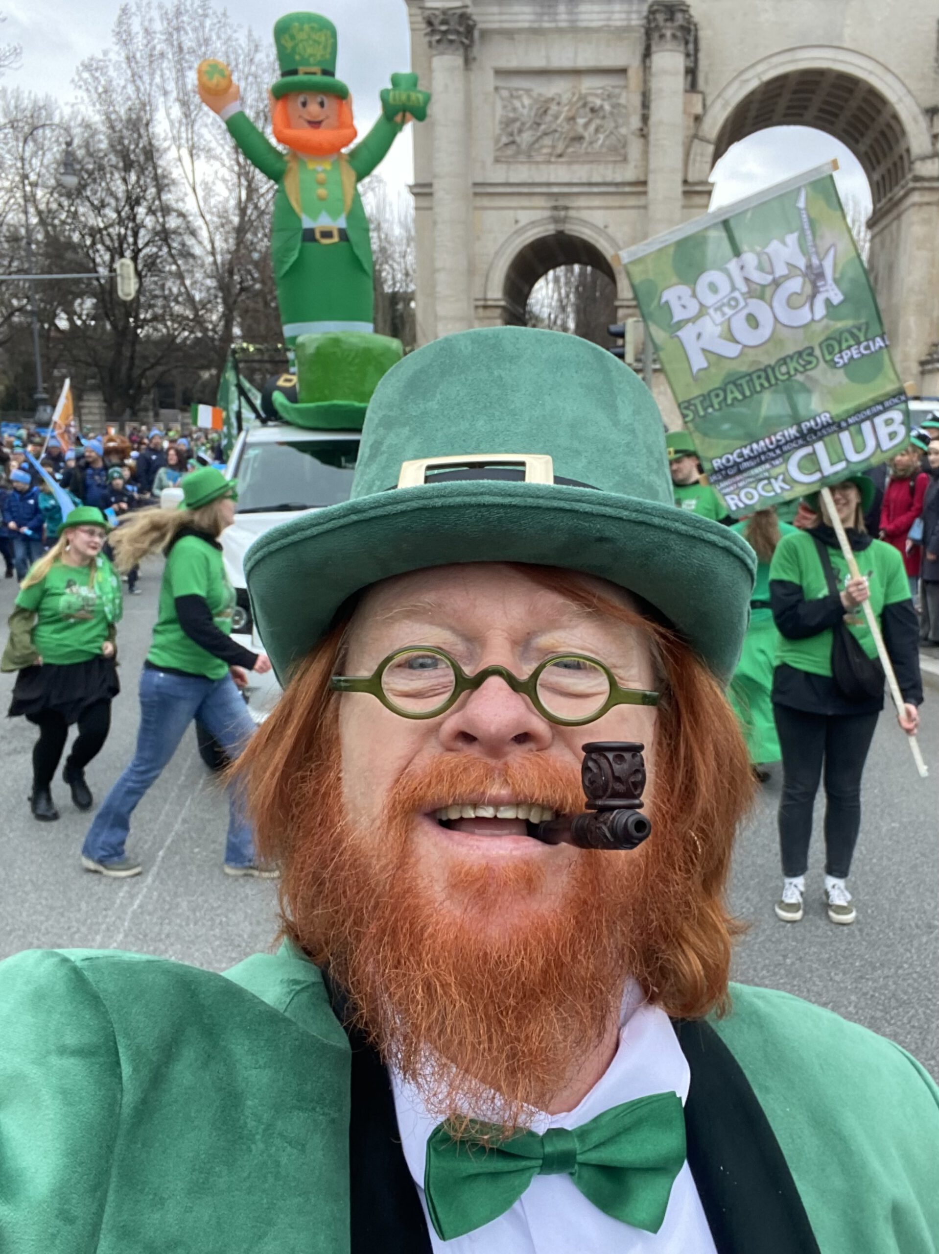 Beschreibung: Selfie mit aufblasbaren Leprechaun am Münchner Siegestor. Ich war das erste Mal als Besucher am St. Patrick‘s Day-Wochenende mit meiner Frau in München - es war super und wir kommen wieder!