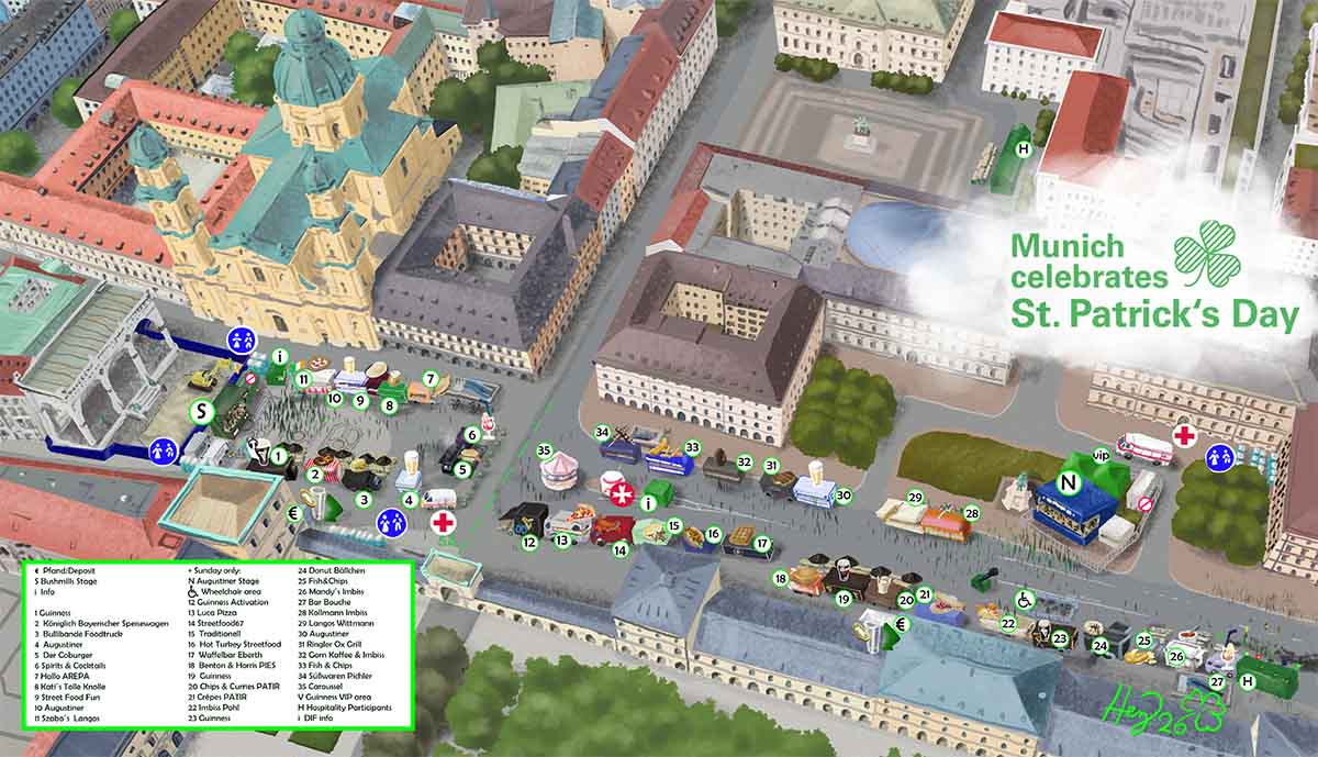 Schon am Samstag (14. März 2026, ab 11 Uhr) sind Irinnen und Iren sowie ihre zahlreichen Freundinnen und Freunde aus München und der ganzen Welt willkommen, sich bei der Pre-Party auf dem Odeonsplatz einzustimmen und auf die irish-bayerische Freundschaft anzustoßen. An beiden Tagen sind vor der Feldherrnhalle zahlreiche Gastronomiestände und eine Bühne fürs begleitende Kulturprogramm aufgebaut. Am Sonntag werden Livebands und Tanzvorführungen zusätzlich auch noch auf einer zweiten Bühne vor dem Reiterdenkmal in der Ludwigstraße zu sehen sein.